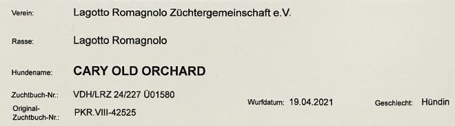 Das ist unsere Zuchthündin Cary Old Orchard.